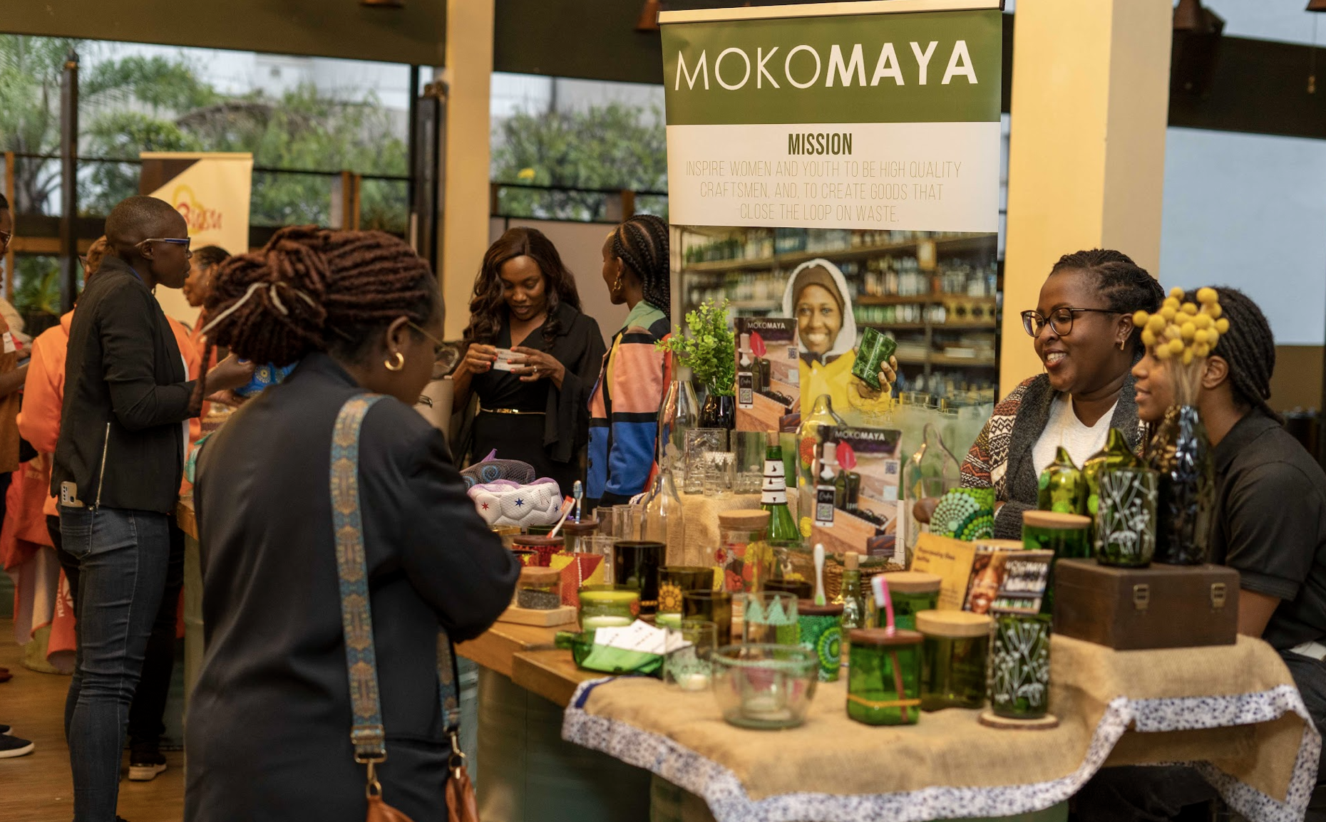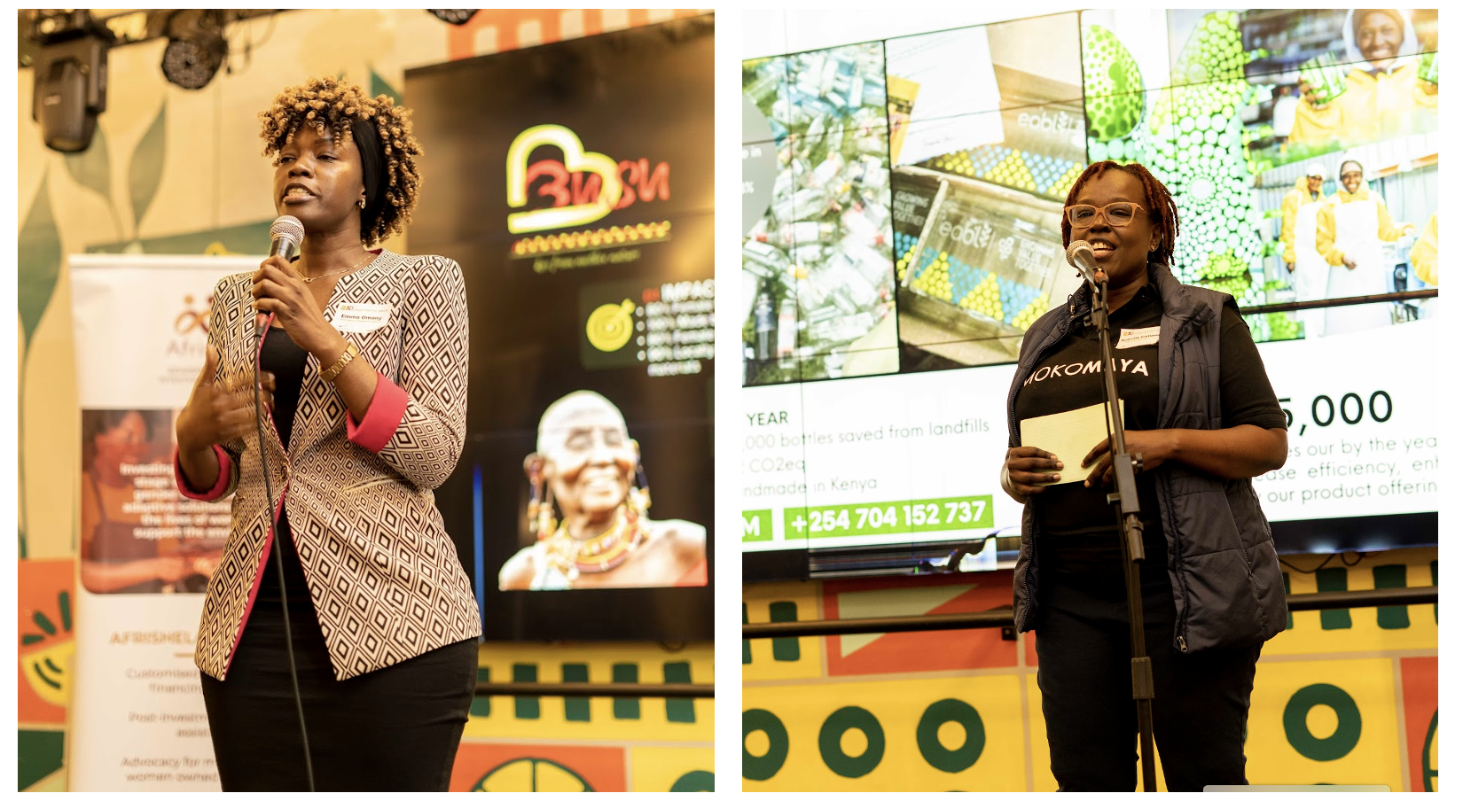 Emma Omany – Busu Skincare Ltd – Eco-friendly, natural skin and hair care products (left); Nyandia Kamawe – MokoMaya Goods Ltd- Up-cycles glassware into beautifully crafted, functional home décor (right).
