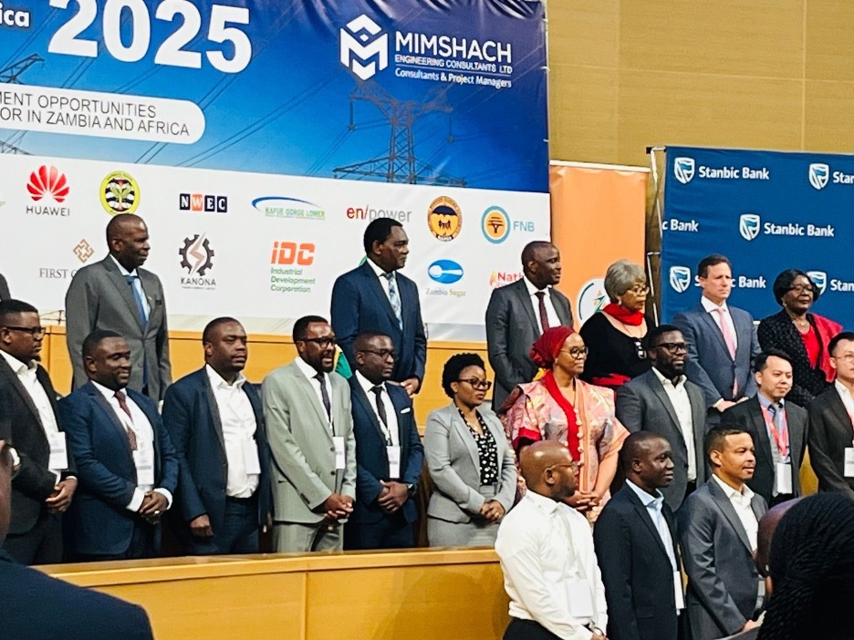 Shiphra Chisha of the Graça Machel Trust and Eng. Melissa Rekas of the Women in Energy Network Zambia (second row, centre) pictured with President Hakainde Hichilema and other public and private sector leaders at the Energy Forum for Africa in Lusaka.